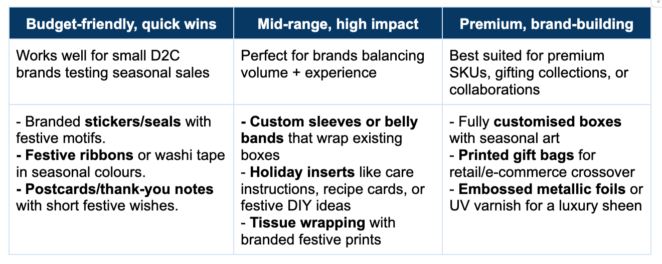 Every customer becomes a micro-influencer if you give them something worth sharing. Even if you can’t afford luxe packaging, festive stickers, witty unboxing notes, or a seasonal sleeve can make your product camera-worthy.