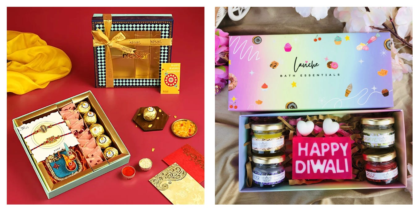 Festive-themed boxes with embedded personalised message cards, and regional motifs (rakhis, diyas, sweets).