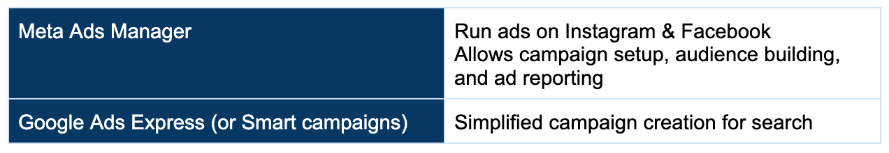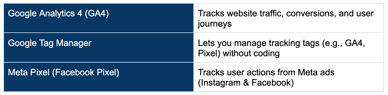These help you measure performance, user behaviour, and conversions across ads and your website.