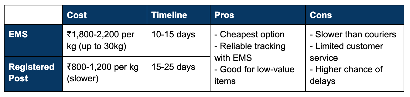 India Post (EMS/Registered Post) is one of the most cost-effective options for D2C brands shipping smaller parcels or low-value products from India to the UK. EMS offers faster delivery and end-to-end tracking, while Registered Post is slower but even more affordable for lightweight shipments.