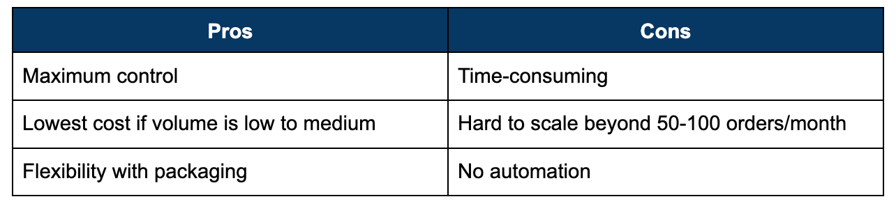 Best for: Very early stage (first 100-200 orders), brands wanting complete control, low volume/high margin products