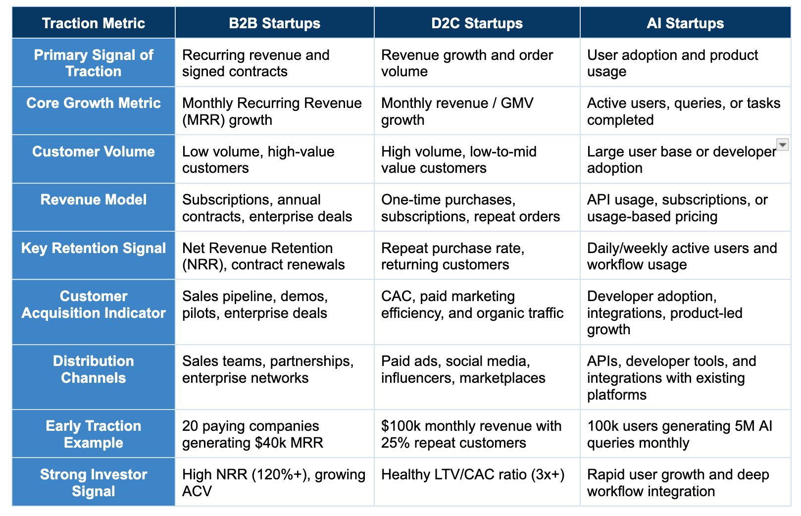 A B2B SaaS company selling to enterprises shows traction very differently from a D2C brand selling skincare online. And AI startups today often demonstrate traction through usage, models, and integrations, not just revenue.