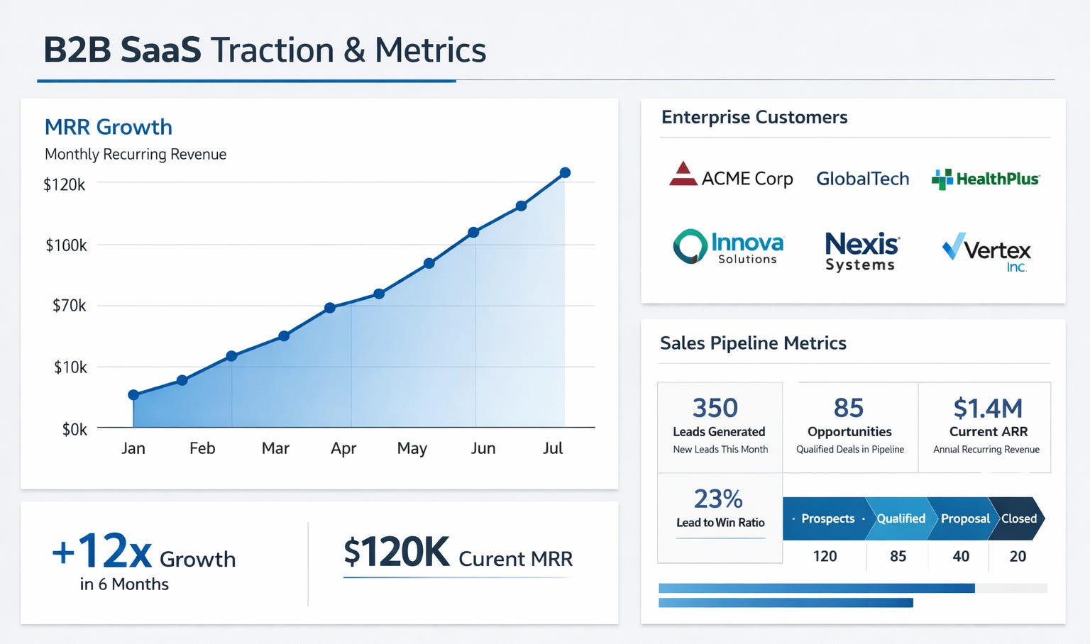 The most compelling traction stories are usually simple. Instead of presenting dozens of numbers, the goal is to highlight a few meaningful metrics that clearly show progress over time. What starts as a few users or early sales gradually turns into steady adoption, repeat customers, and predictable growth.