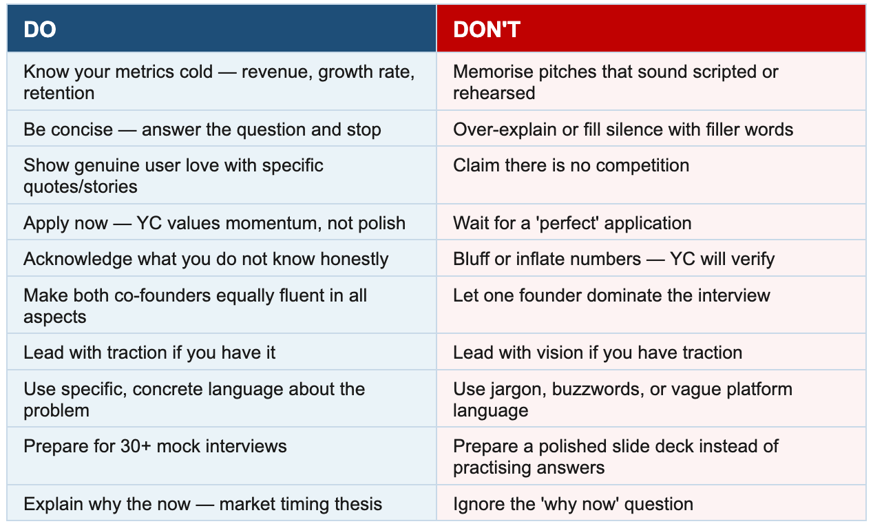 A: Confidence comes from depth of knowledge, not from bravado. The founders who impress YC most are those who know their numbers, their users, and their problem cold, and who can articulate uncertainty clearly. Arrogance shows up as dismissing competition, overstating traction, or becoming defensive. Stay grounded, specific, and curious.